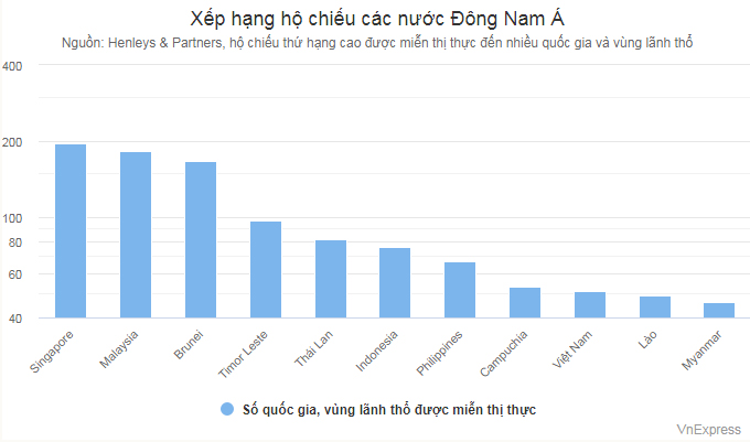 Tại khu vực Đông Nam Á, Singapore tiếp tục giữ vị trí đứng đầu, sở hữu hộ chiếu quyền lực nhất thế giới. Công dân nước này được miễn thị thực tới 195 quốc gia, vùng lãnh thổ. Lào ở vị trí 93 và Myanmar ở vị trí 94. Các nước còn lại xếp trên Việt Nam, vị trí từ 51 đến 89.